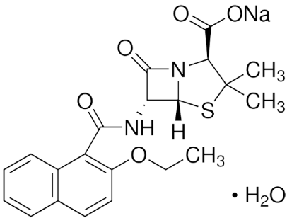 別名萘夫西林鈉; (2S,5R,6R)-6-[(2-乙氧基萘-1-甲酰)氨基]-3,3-二甲基-7-氧代-4-硫雜-1-氮雜雙環[3.2.0]庚烷-2-甲酸鈉鹽一水合物;Sodium (2S,5R,6R)-6-[(2-ethoxynaphthalene-1-carbonyl)amino]-3,3-dimethyl-7-oxo-4-thia-1-azabicyclo[3.2.0]heptane-2-carboxylate hydrate; Nafcillin sodium monohydrate