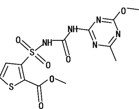 別名 噻吩黃隆, 3-(4-甲氧基-6-甲基-1,3,5-三嗪-2-基)-1-(2-甲氧基甲酰基噻吩-3-基)-磺酰脲;Thifensulfuron-methyl